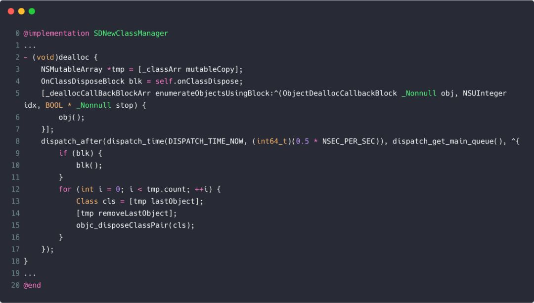 我们通过 objc_setAssociatedObject 的方式可以为每个 NSObject 对象动态关联上一个 SDNewClassManager 实例,在 SDNewClassManager 实例里面持有当前对象所使用的临时类。当前对象销毁时也会销毁这个 SDNewClassManager 实例,然后我们就可以在 SDNewClassManager 实例的 dealloc 方法里面做一些销毁临时类的操作。但这里我们又不能立即做销毁临时类的操作,因为此时这个对象还没有完全析构,它还在做一些其它善后操作,如果此时去销毁那个临时类必然会造成 crash,所以我们需要稍微延迟一段时间来做这些临时类的销毁操作,代码如下: