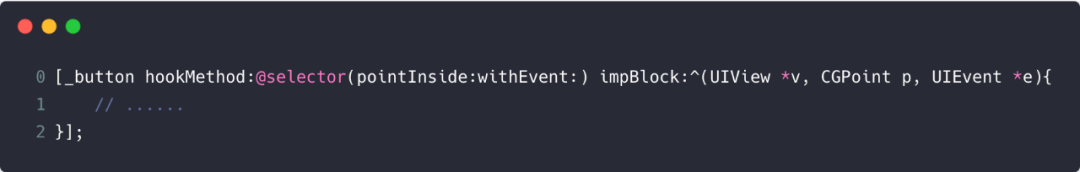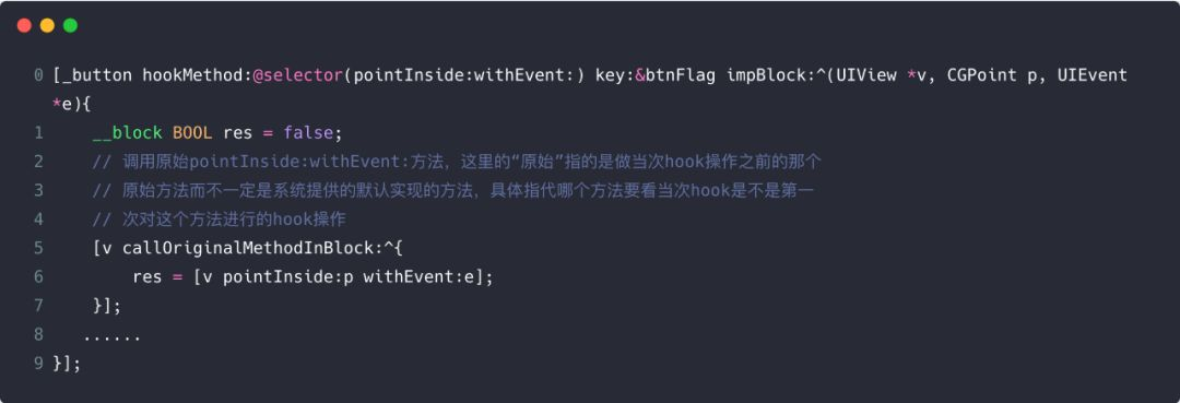 因为目标 button 的 pointInside:withEvent:对应的 method 的 imp 指针被替换成了_objc_msgForward,所以我们需要另外新增一个方法 A 和方法 B 来分别存储目标 button 的 pointInside:withEvent:方法的 block 自定义实现和原生实现。然后当需要在自定义的方法内部调用原始方法时通过调用 callOriginalMethodInBlock:这个 api 来显式告知,示例代码如下:
