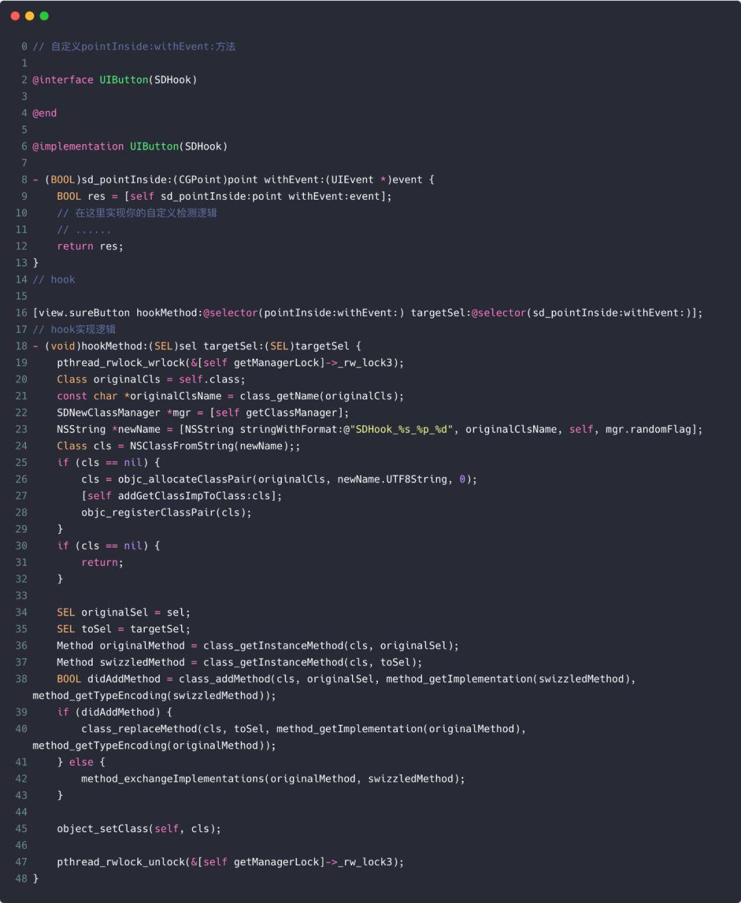 我们的解决方案是为每个被 hook 的目标原生方法生成一张 hook 表,按照 hook 发生的顺序依次为其生成内部 selector 并加入到 hook 表中。当 keywindow 收到 layoutSubviews 消息时,我们从 hook 表中取出该次消息对应的 hook selector 发送给 keywindow 让它执行对应的动作。如果删除某个 hook 也只需将其对应的 selector 从 hook 表中移除即可。代码如下: