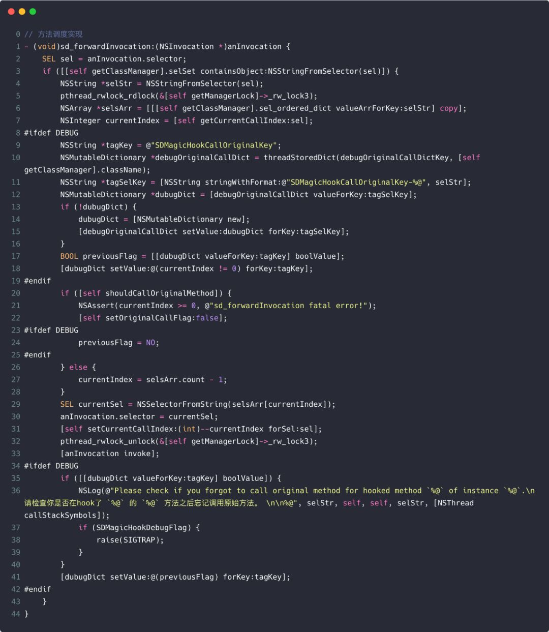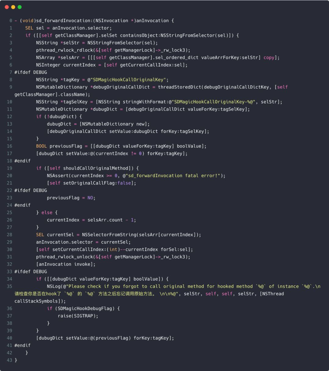前面已经提到过,我们实现了对 hook 目标方法的自定义调度,这就使得我们有机会在这些方法调用结束后检测其是否在方法执行过程中通过 callOriginalMethodInBlock 调用原始方法。如果发现某个方法体不是被 hook 的目标函数的最原始的方法体且这次方法执行结束之后也没有调用过原始方法就会通过 raise(SIGTRAP)方式发送一个中断信号暂停当前的程序以提醒开发者当次 hook 操作没有调用原始方法。