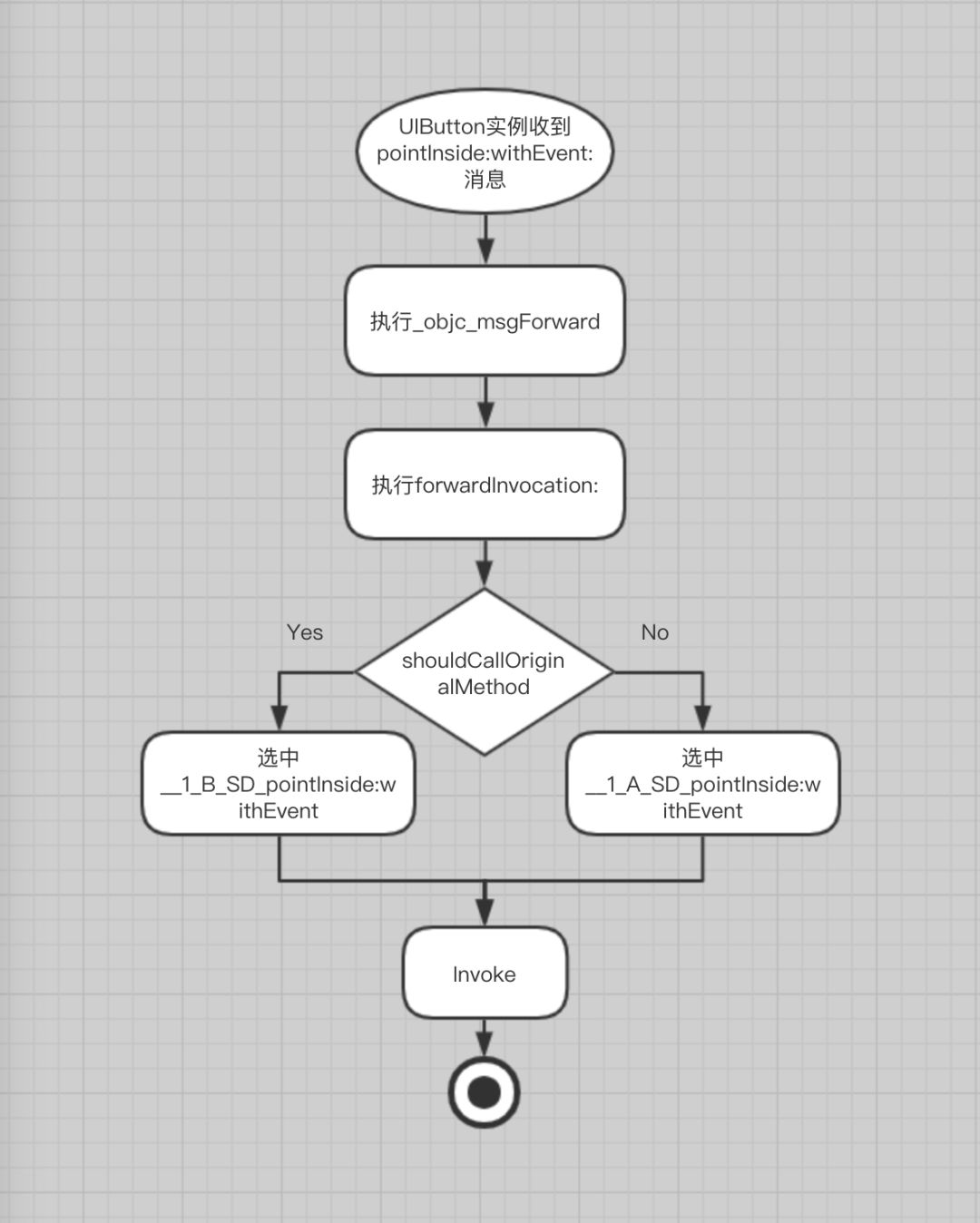 当目标 button 实例收到 pointInside:withEvent:消息时会启用我们自定义的消息调度机制,检查如果 OriginalCallFlag 为 false 就去调用自定义实现方法 A,否则就去调用原始实现方法 B,从而顺利实现一次方法调度。流程图及示例代码如下:
