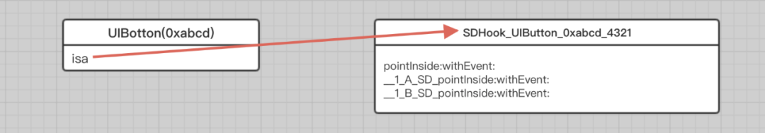 那么眼下的关键问题就是找到一个合适的 Selector 来映射到被 hook 的原生函数。而目前来看,我们唯一可以在当前编译环境下方便调用且和这个 block 还有一定关联关系的 Selector 就是原方法的 Selector 也就是我们的 demo 中的pointInside:withEvent:了。这样一来pointInside:withEvent:这个 Selector 就变成了一个一对多的映射 key,当有人在外部向我们的 button 发送 pointInside:withEvent:消息时,我们应该首先将 pointInside:withEvent:转发给我们自定义的 block 实现的 IMP,然后当在 block 内部再次向 button 发送 pointInside:withEvent:消息时就将这个消息转发给系统原生的方法实现,如此一来就可以完成了一次完美的方法调度了。