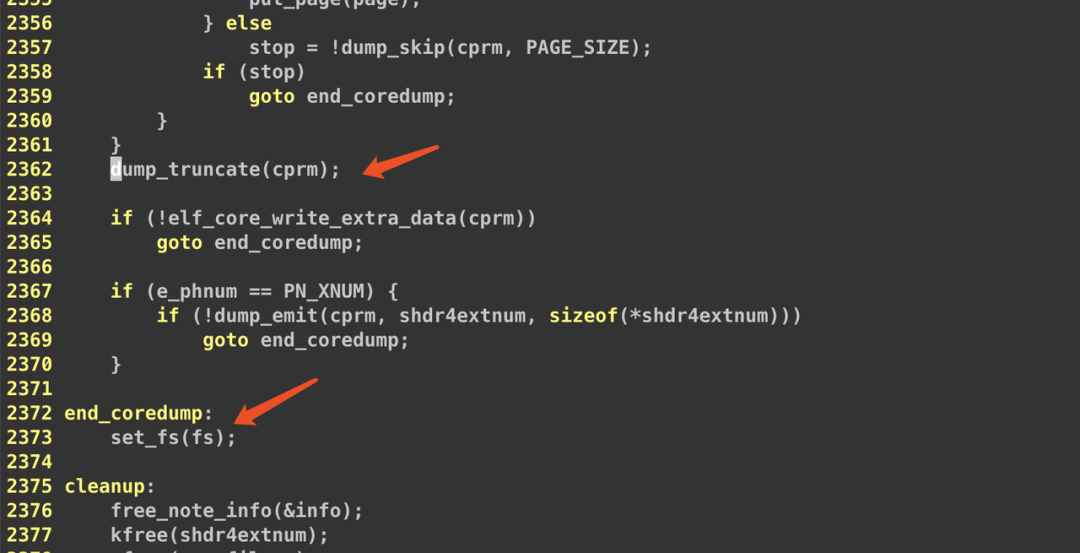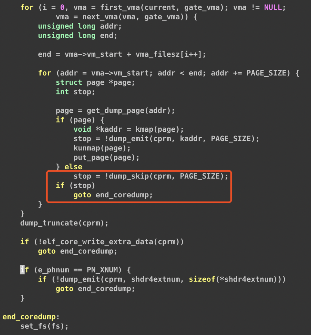 不出所料,dump_skip 返回 0 后 coredump 停止。也就是说第二阶段只 dump 了一部分 vma 就停止了。导致 coredump 写入不完整。