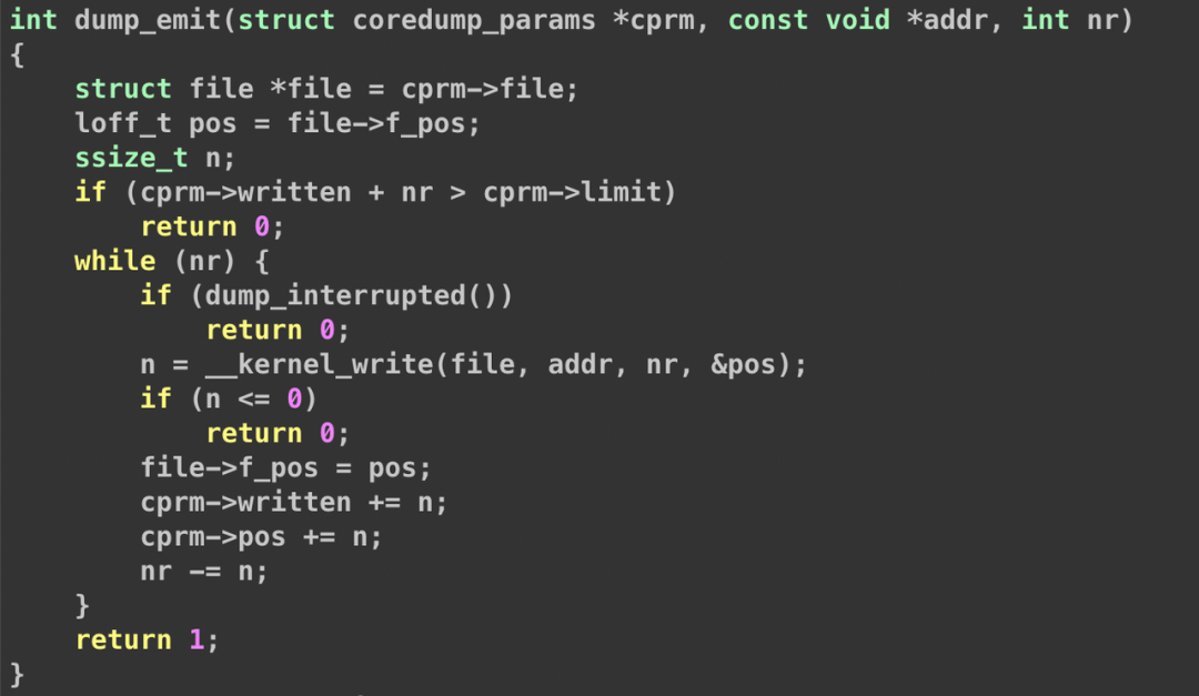 不出意外和怀疑的一致,dump_emit 返回 0 了,此时写入到 core 文件的有 37623414784 字节。主要因为 dump_interrupted 检测条件为真。(cprm->limit = -1 不会进入 if 逻辑,kernrel_wirte 写 pipe 也没有出错)。