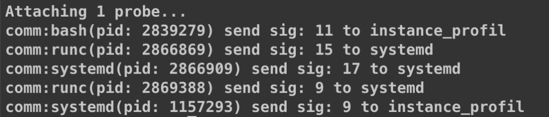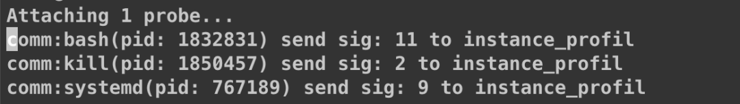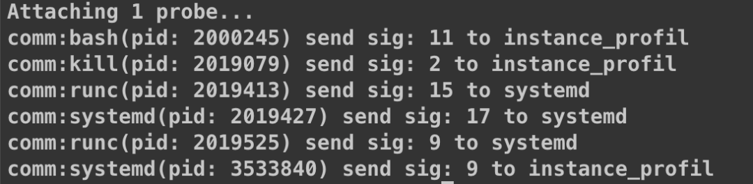 printf("comm:%s(pid: %d) send sig: %d to %s\n", comm, pid, arg0, $t->comm);