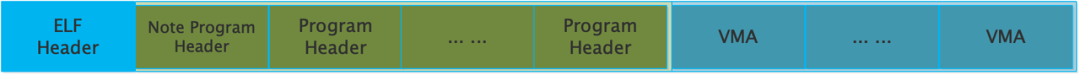 coredump 文件其实是一个精简版的 ELF 文件。coredump 过程并不复杂。coredump 的过程分为 2 个阶段,一个阶段是写 program header(第一个 program header 是 Note Program Header),每个 program header 包含了 VMA 的大小和在文件的偏移量。gdb 也是依此来确定每个 VMA 的位置的。另一个阶段是写 vma 的数据,遍历进程的所有 vma。然后写入文件。一个 coredump 文件的结构可以简单的用如下图的结构表示。