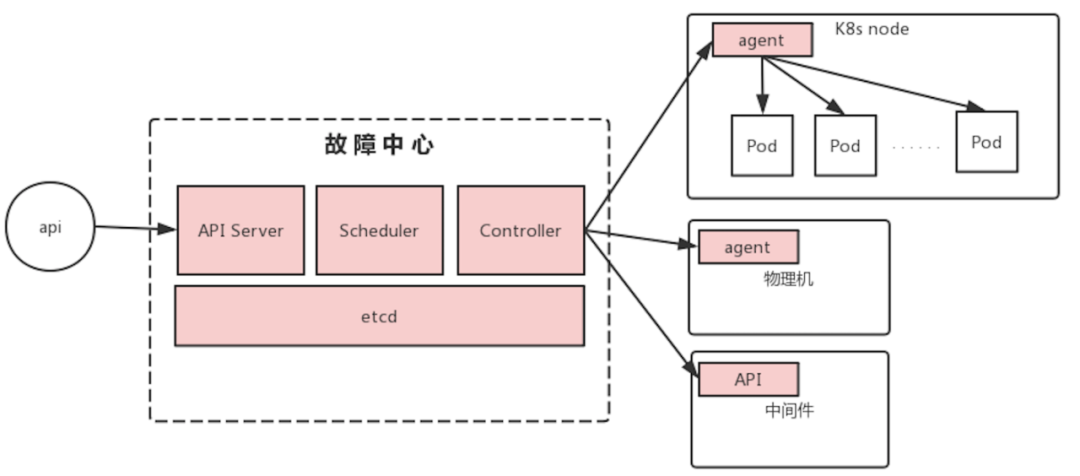 故障中心在收到上述类似声明后,便开始向内部研发体系平台寻找符合条件的实例,并自动安装故障 agent,通过将相关指令下发给 agent,实现故障注入的目的。故障中心适当借鉴了 Kubernetes 的架构设计与理念,其架构设计如下: