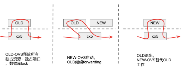 双进程升级(形象的说就是热替换):通过硬件资源冗余,让新老 ovs 在升级中并存,老的 ovs 继续进行转发,使得流量不会断,新的 ovs 完成初始化之后,接管流量。