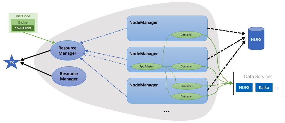 上图中灰色背景区域是 YARN 的主要架构, 主要包含两种角色:
