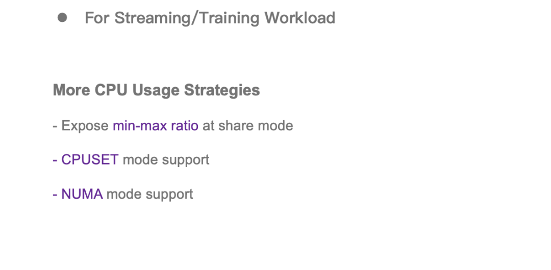 除了开启 YANR 原生默认支持的 CGroup 限制之外,我们还配置了更加丰富的 CGroup 管理策略,比如在 share 模式下支持自定义的最大值限制,支持绑核,支持绑 NUMA 节点等. 通过这些措施,给流式作业和训练作业更加灵活的管控策略,满足不同场景下的隔离或共享需求。