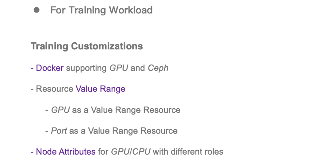 为了更灵活的资源申请,定制了带范围的资源值 (传统的 YARN 资源只有个数, 没有范围,比如多少个 CPU,多少 GB 内存,但在训练场景下,有时希望有范围,比如当需要两个 GPU 卡时,不止希望随意的两张卡,而是希望要一台机器上两个连号的 GPU 卡,比如卡 0 和卡 1 是连号的,而卡 0 和卡 2 不是连号的。这个场景同样也适用于端口号。)