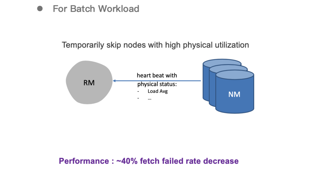 离线批处理场景经常会遇到"Fetch Failed"的问题,主要来源是本地的磁盘 IOPS 不足,导致 Shuffle Service 卡住,为了缓解这个问题,我们在资源调度的过程中加入目标主机 LoadAvg 的考虑因素,如果一台机器的 LoadAvg 过高,则暂时跳过对其分配新任务. 通过这个机制,将"Fetch Failed"问题降低了约 40%。