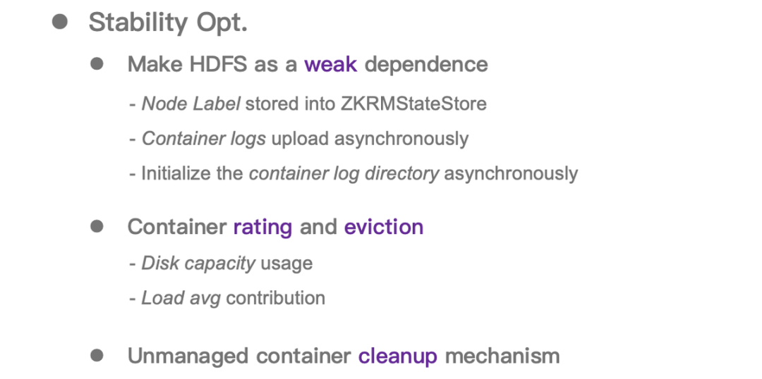 字节跳动的 YARN 服务规模巨大,在稳定性方面遇到了很多挑战,有很多细节方面的优化, 在这里由于时间有限,挑选几个比较有代表性的优化点跟大家分享一下: