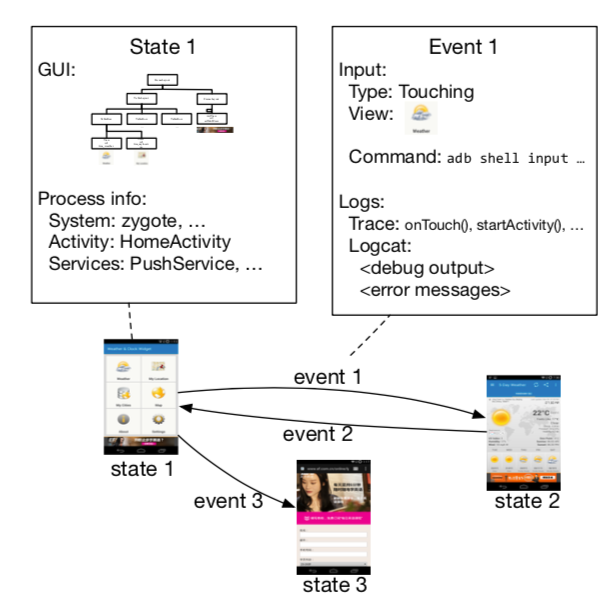 它们核心的逻辑聚焦在“如何生成”测试逻辑。以 MBT 为例,GUI 测试(客户端测试)过程中的某个页面,可以被定义为一个状态(State),利用该页面对应的 GUI 树,我们可以提取其中更有意义的操作,比如从 state1 通过 event3 可以到达 state3,从 state2 通过 event2 可以到达 state1。这样,测试生成的问题转化成对有向图的遍历问题。像 Monkey 之类的随机测试工具,由于缺少对于 Log 的更高层面的表述,常让开发者对其有担忧: