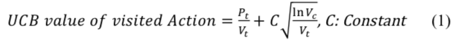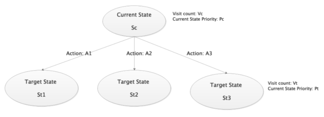 公式 1 即为单步的 UCB 公式,其中左项为优先级项,右项为访问次数项,两者相加产生结合后的 UCB 值,作为动作的选取标准。图 5 为公式 1 做了图例解释,在当前节点 Sc 下,对于已访问过的 Action:A1-A3,我们知道其目标节点,采用公式 1 计算得到 Action 的 UCB 值,对于其他未访问过的 Action,我们不知道目标节点是什么,则取 Action 自身的 priority 作为 UCB 结果,通常 Action 自身的 priority 高于多次访问后的 UCB 值,所以我们仍会优先尝试未访问过的动作。