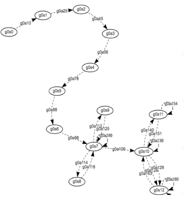 如前文所述,我们将页面的 GUI 信息抽象成模型中的 State,将执行的动作抽象成模型中的 Action,通过 State 作为图的节点,Action 作为图的边,连接形成有向有环图模型。图 3 展示了有向有环图的局部示例,其中箭头虚线代表着执行动作,连接起了各个节点。