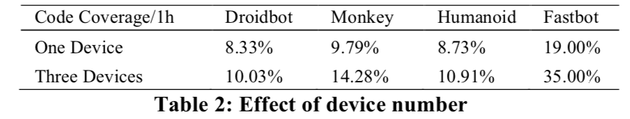 此外,随着设备数的增加,Fastbot 的多机协同能力将带来更可观的性能优势。表 2 中展示了 3 台设备并行时,各工具的代码覆盖率增长情况,可以看到 3 台设备并行时,Fastbot 代码覆盖率由单机时的 19%增长至 35%,涨幅达到 84%;相比之下 Droidbot 和 Humanoid 在 3 台并行时的提升只有 20.41%和 24.97%,而 Monkey 也有 45.79%的代码覆盖率提升。