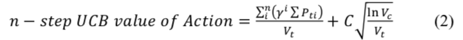 单步 UCB 算法耗时少,且其引入访问次数平衡项后,很好的阻止了局部循环的发生,使动作决策更加分散化。此算法的一个缺点是其只考虑了当前一步以内的 UCB 最优动作,若将 N 步以内的可执行动作都加入考虑范围,选择结果可能有所不同。为此,我们同时介绍 N 步的 UCB 算法,该算法会遍历当前动作及该动作以后的 N-1 步以内所有可执行的动作,将所有动作的优先级乘上衰减系数并累加,最终的结果最为当前动作的 UCB 值。N 步 UCB 算法的公式由公式 2 所示: