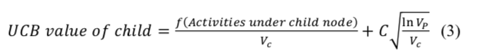 然而,不论是单步 UCB 算法或是 N 步 UCB 算法,都只是利用了一步或 N 步以内的信息,而非利用到整个模型上的信息。由于环路的存在,模型上的反向传播无法顺利进行。我们希望能够实现全局的方向传播,将新访问到的页面信息一直传递到起始节点。当覆盖到新的 Activity 时,我们希望路径上的每个节点都得到更新。因此,我们考虑将有向有环图模型裁剪为树状结构,从而避免环路带来的干扰。树的节点代表着模型中的 State,在节点中,我们保存上一步的 Action,记录上一步的 State 作为父节点,记录下一步可以到达的 State 为子节点。使用 MTree 算法后各子节点的优先级由公式 3 给出: