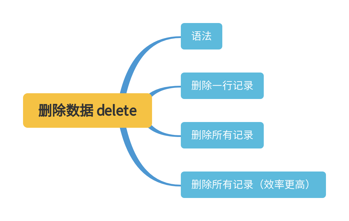 如果你想从表中删除所有数据,不要使用delete,可以使用 truncate 表名,它完成相同的工作,但是速度更快,因为它实际上是删除原来的表并重新创建一张表,而不是逐行删除表中的数据