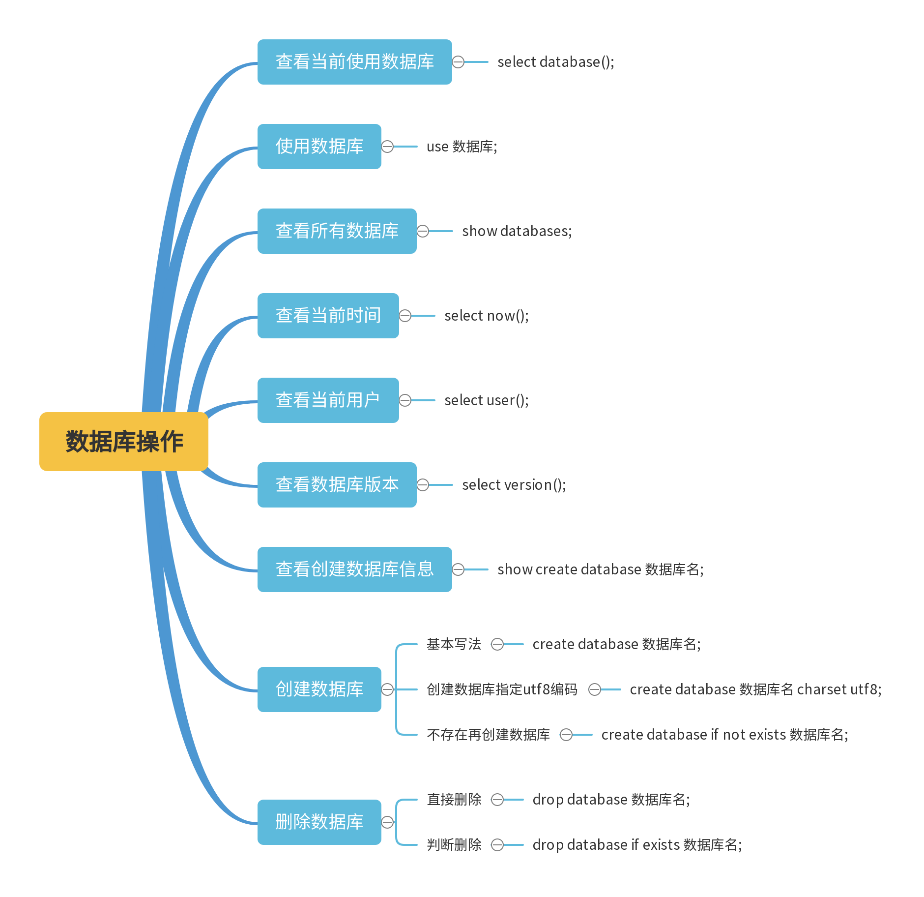 对数据库的操作,包括查看当前使用的哪个数据库,使用数据库,查看所有数据库,查看当前时间,查看当前用户,查看数据库版本,查看创建数据库语句,创建数据库,以及删除数据库等围绕着数据库的相关操作