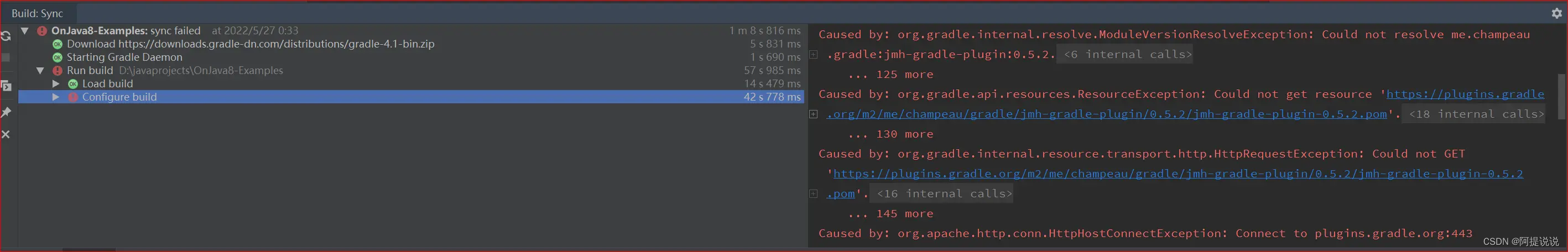 由于示例项目用了gradle来构建,有很多插件一直下载超时,即使用了VPN,根本不能构建,花了很长时间。