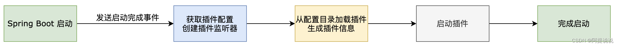 在监听到Spring Boot启动后,插件开始加载,从配置文件中获取插件配置、创建插件监听器(用于主程序监听插件启动、停止事件,根据事件自定逻辑)、根据获取的插件配置从指定目录加载插件配置信息(插件id、插件版本、插件描述、插件所在路径、插件启动状态(后期更新))、配置信息加载完成后将插件class类注册到Spring返回插件上下文、最后启动完成。