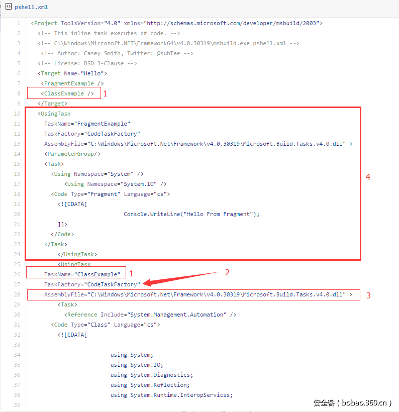 同样结合上文提到的xml格式,编写代码实现在Inline Tasks中执行shellcode,实现代码的下载地址为: