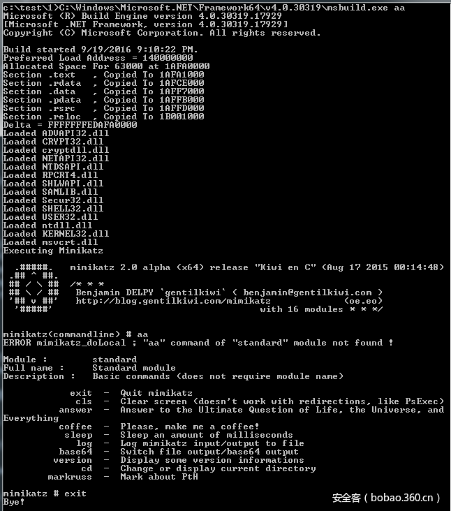 对照上文提到的xml格式,编写代码实现在Inline Tasks中内存加载64位的mimikatz.exe,实现代码的下载地址为: