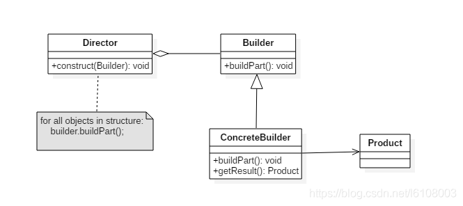 通过类图我们不难发现生成器模式包含了四个角色,主导者、产品、抽象生成器接口以及具体生成器接口,需要注意的是产品最终是从具体生成器获取的而不是主导者。举个例子,比如你要修房子,房子包含了门、窗、墙等等,那你首先要找一队工人和设计师,这里工人就是具体的生成器,设计师则是主导者,由设计师告诉工人该做什么,也就是建造流程,具体怎么修建完成则是工人的事,最终房子修好了你是去找工人要,而不是找设计师要。