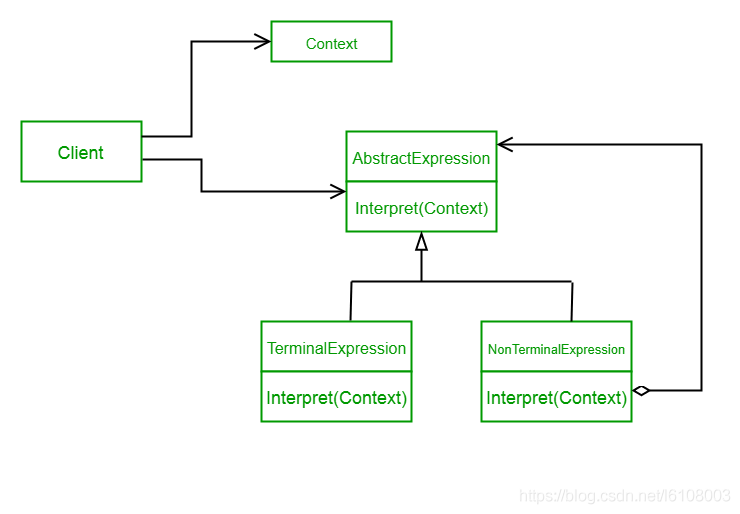 - 抽象表达式:声明一个包含interpreter方法的接口,所有终结符表达式或非终结符表达式需要实现该接口并重写该方法。