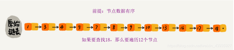 对于一个单链表来讲,即便链表中存储的数据是有序的,如果我们要想在其中查找某个数据,也只能从头到尾遍历链表。这样查找效率就会很低,时间复杂度会很高,是 O(n)。下面我们就通过4张图片看看如何从链表转化成跳表: