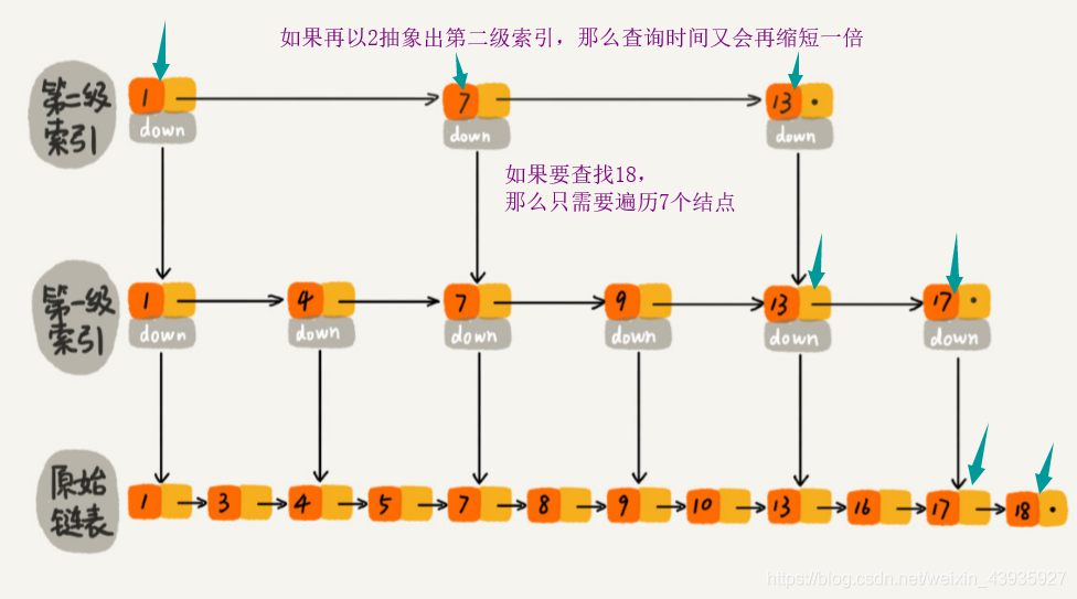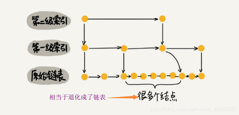 作为一种动态数据结构,我们需要某种手段来维护索引与原始链表大小之间的平衡,也就是说,如果链表中结点多了,索引结点就相应地增加一些,避免复杂度退化,以及查找、插 入、删除操作性能下降。