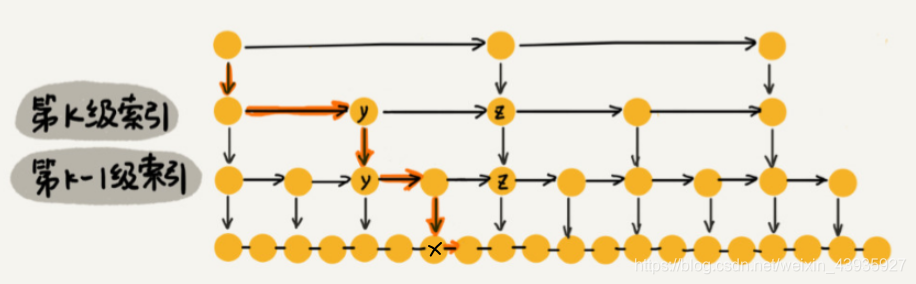 - 在第 k 级索引中,我们遍历到 y 结点之后,发现 x 大于 y,小于后面的结点 z,所以我们通过 y 的 down 指针,从第 k 级索引下降到第 k-1 级索引。