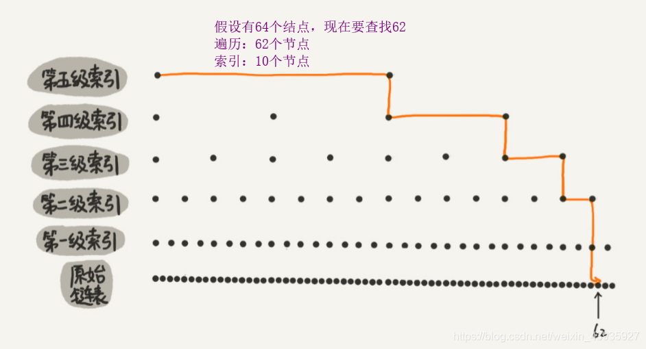 通过上面的分析,我们得到 m=3,所以在跳表中查询任意数据的时间复杂度就是 O(logn)。这个查找的时间复杂度跟二分查找是一样的。换句话说,跳表其实是基于单链表实现了二分查找