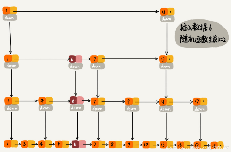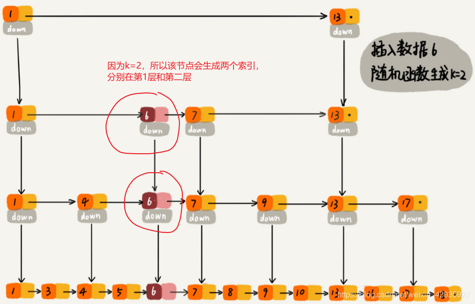 我们通过一个随机函数,来决定将这个结点插入到哪几级索引中,比如随机函数生成了值 K,那我们就将这个结点添加到第一级到第 K 级这 K 级索引中。