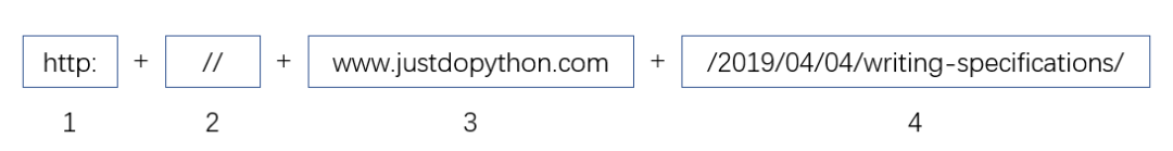 它对应的 URL 就是 http://www.justdopython.com/2019/04/04/writing-specifications/ ,按照 URL 的统一格式可以分解如下:
