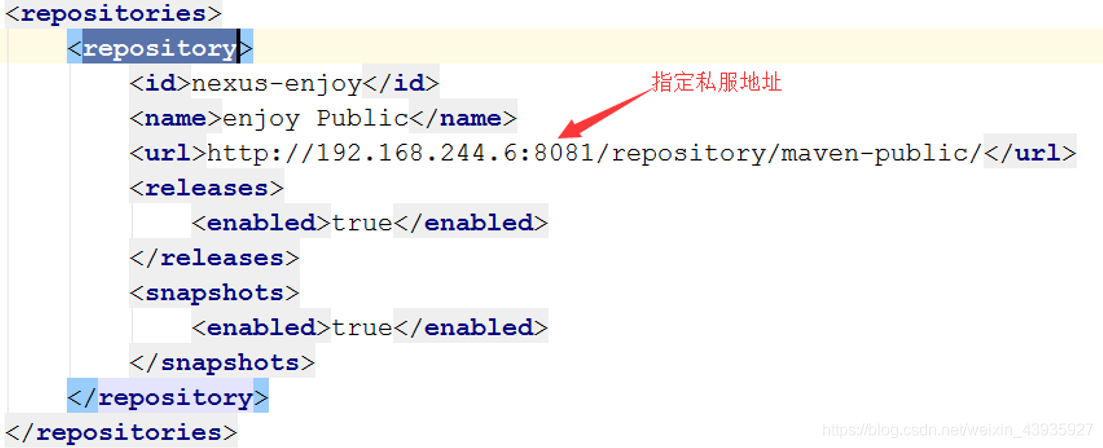 在maven的setting文件里,通过mirror指定私服地址,此方式对全局生效