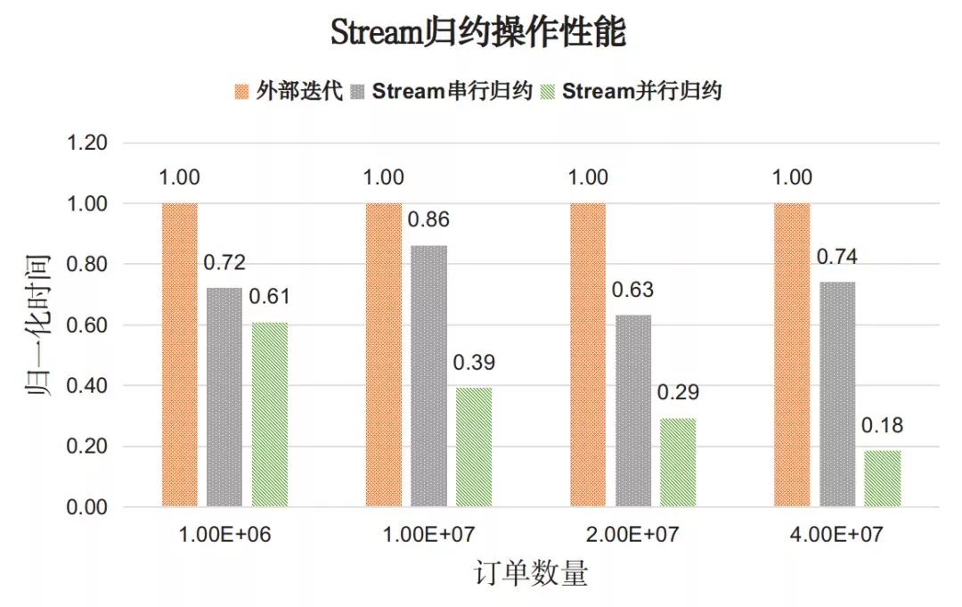 从实验一、二的结果来看,Stream串行执行的效果都比外部迭代差(很多),是不是说明Stream真的不行了?先别下结论,我们再来考察一下更复杂的操作。测试内容:给定订单列表,统计每个用户的总交易额。对比使用外部迭代手动实现和Stream API之间的性能。我们将订单简化为 构成的元组,并用 Order对象来表示。测试程序ReductionTesthttps://github.com/CarpenterLee/JavaLambdaInternals/blob/master/perf/StreamBenchmark/src/lee/ReductionTest.java1、Stream API的性能普遍好于外部手动迭代,并行Stream效果更佳;1、使用Stream并行归约在单核情况下性能比串行归约以及手动归约都要差,简单说就是最差的;2、随着使用核数的增加,Stream并行效果逐渐变好,多核带来的效果明显。以上两个实验说明,对于复杂的归约操作,Stream串行归约效果好于手动归约,在多核情况下,并行归约效果更佳。我们有理由相信,对于其他复杂的操作,Stream API也能表现出相似的性能表现。结论