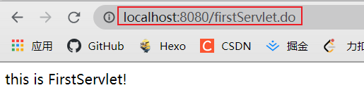 然后启动 Tomcat,并在浏览器访问我们写好的 FirstServlet