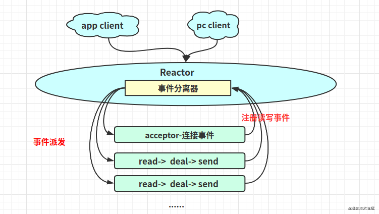- Acceptor 线程池仅仅只用于客户端的登陆、握手和安全认证,一旦链路建立成功,就将链路注册到后端 subReactor 线程池的 IO线程上,由IO 线程负责后续的IO 操作。