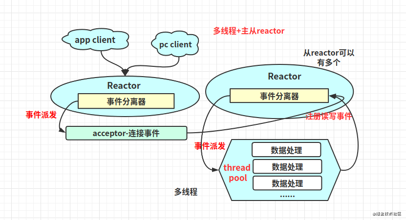 - 服务端用于接收客户端连接的不再是个 1个单独的 NIO 线程,而是一个独立的 NIO线程池。Acceptor接收到客户端 TCP连接请求处理完成后(可能包含接入认证等),将新创建的 SocketChannel 注册到 IO 线程池(sub reactor线程池)的某个IO 线程上,由它负责 SocketChannel 的读写和编解码工作。