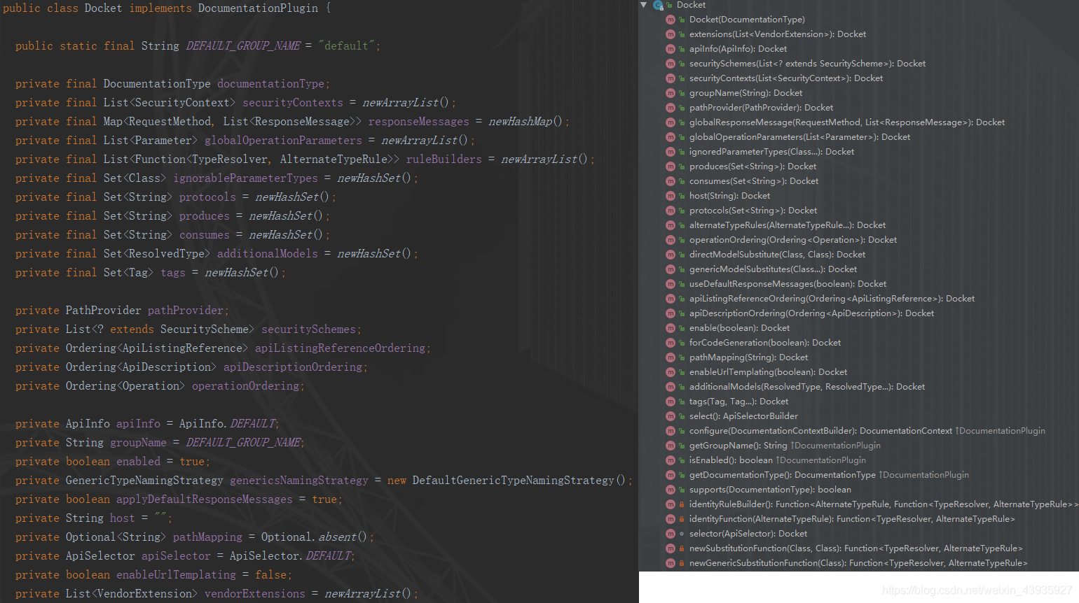 打开 Docket 的源码,我们可以看见 Docket 提供了很多可以配置的属性,并且提供了相应的 setter(注:方法与属性名同名,返回值是 this(链式编程))