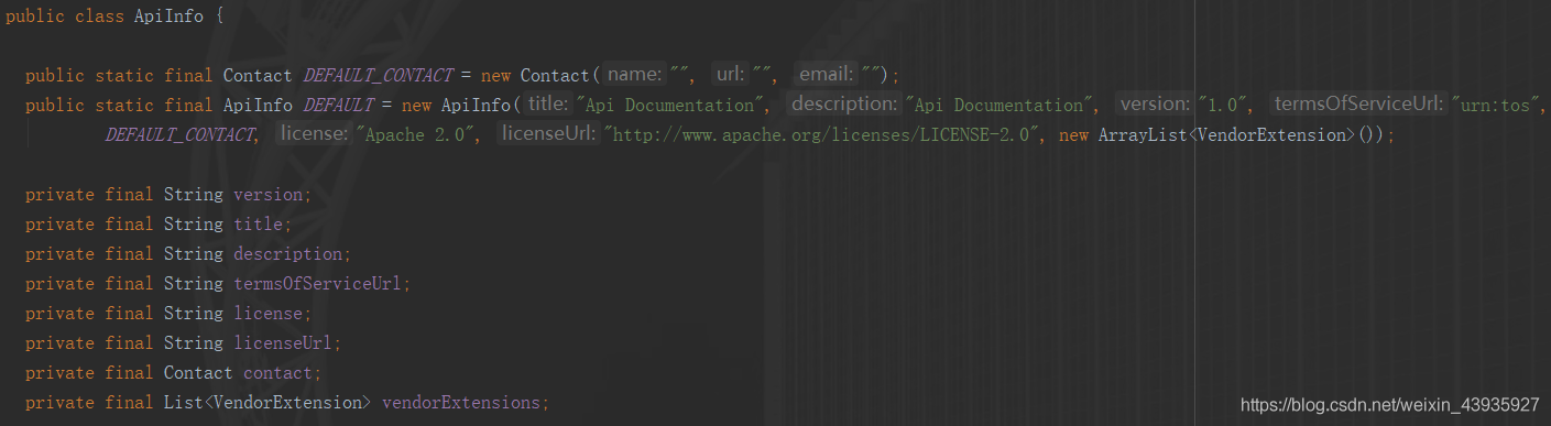 ApiInfo 见名知意,提供了一些基本信息的配置,这些配置信息可以显示 UI 界面上。同样的,点进它的源码看看
