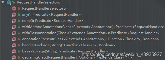 接口扫描方案。通过 ApiSelectorBuilder#apis() 方法配置(也是链式编程),在 RequestHandlerSelectors 提供了配置方案: