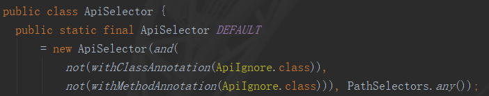 在 ApiSelectorBuilder 中提供了默认配置方案 DEFAULT,即不扫描所有标有 @ApiIgnore 注解的类和方法,允许所有的请求路径: