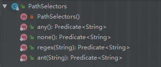 本篇我们先来看第二种,这种方式可以通过筛选 API 的 url 来进行过滤;通过 ApiSelectorBuilder#paths() 方法配置,在 PathSelectors 提供了配置方案:
