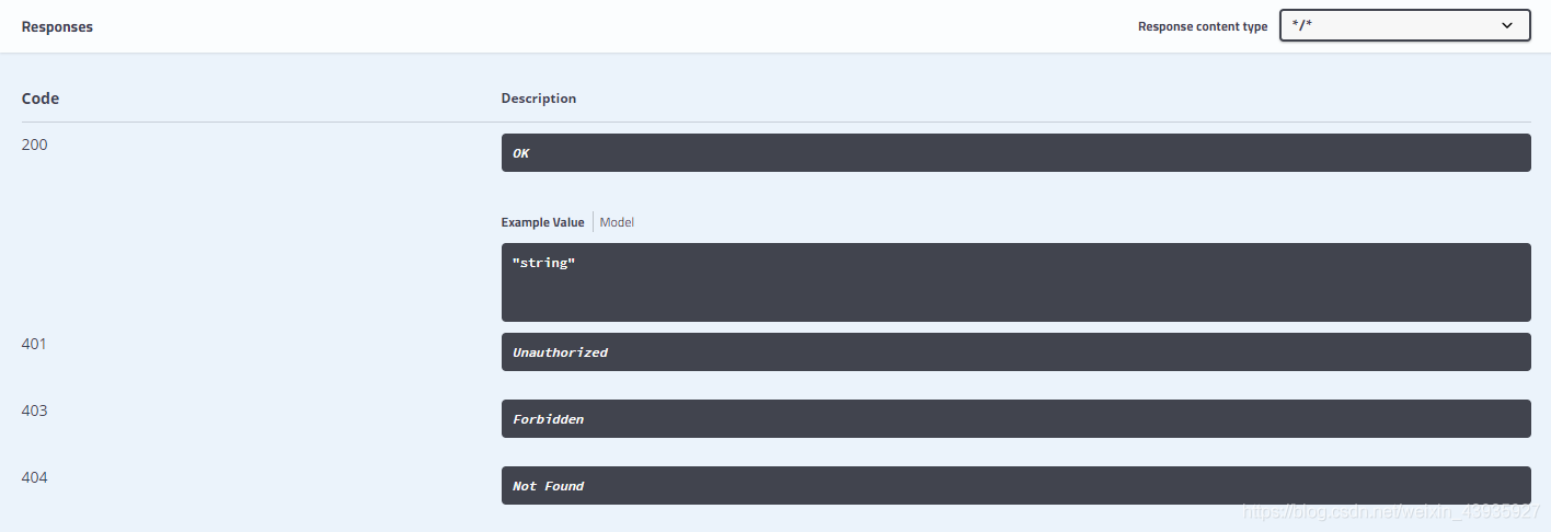 点开接口文档中的接口,可以看见,在 Respon 中 Swagger 默认提供了 200,401,403,404 这几个状态码