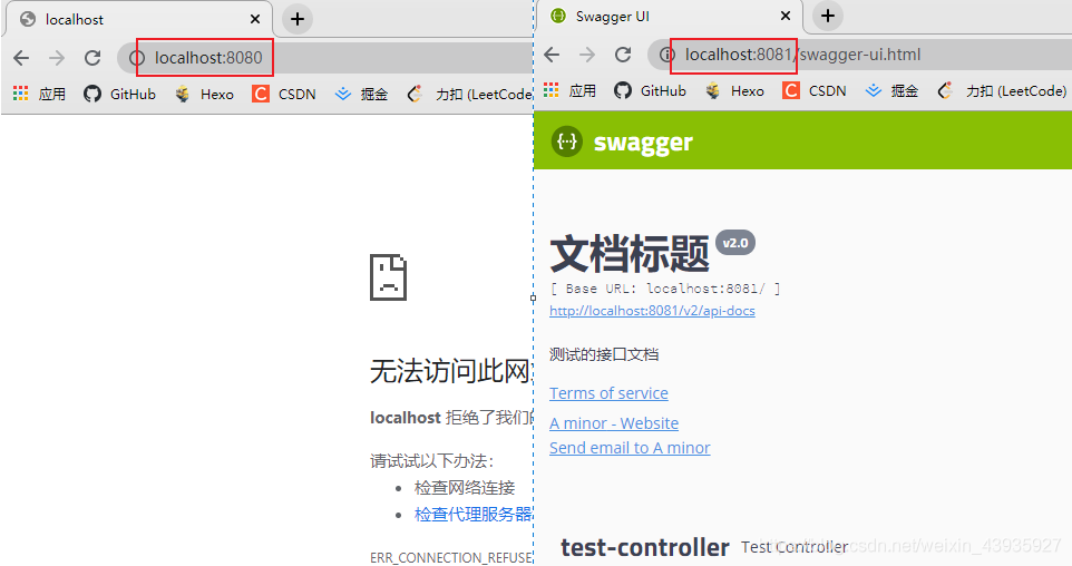 然后重启项目,就可以发现,8080 端口已经无法访问了,但8081 可以。