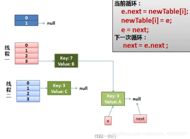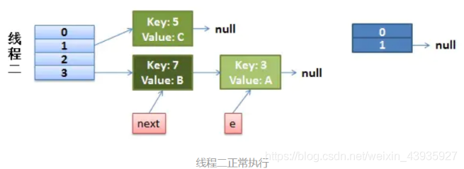 Entry<K,V> next = e.next; // 线程一执行至此被挂起,执行线程二